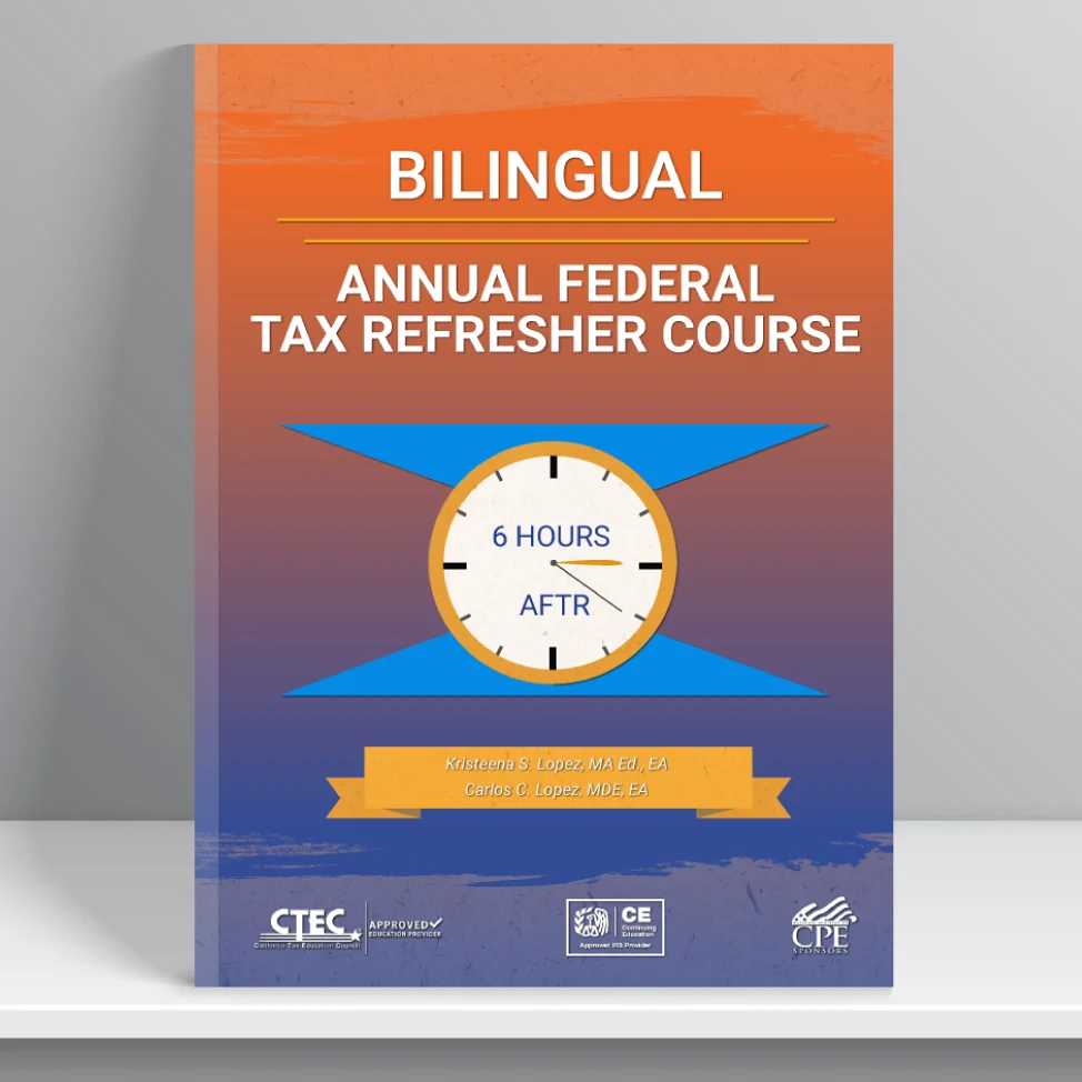 Paquete bilingüe (EN/ES) para principiantes con 1040 línea por línea y 18 horas CE: 10 Ley de Impuesto Federal, 6 AFTR (curso + examen) y 2 Ética. Aprobación 70%+ y completar antes del 31 de diciembre (medianoche).